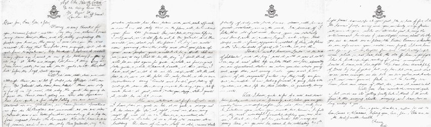 the boys sail away." "Well we are all still alive and well although there are a lot of chaps who left with me from New Zealand that have been killed - there are only a few of us left now." "We have finished operations as far as Wellingtons are concerned................converting to a big new four engined bomber - the Lancaster ............... so now I am the only NZ'er in the plane with two Canadians and four R.A.F.............. The new kite is very nice to fly in I only wish we could fly her out to New Zealand." "Had a weeks leave in London at the end of September and Oh Boy! was it wild or was it wild. I'll say it was! Still life is like that over here, especially on an operational station as when you see chaps going out and then not coming back --- you want to see some of the sergeants parties .............." "Well I have quite a few ops now and have been pretty well all over Germany ........... The old Hun really tries to entertain you when invade his domain, he puts on the most wonderful fireworks display you ever did see ......... Light tracer comes up at you just like a hose of fire, while the 'heavies' poop away and you see lovely orange flashes ......... hundreds of searchlights weave about the sky, yes sir a raid on a place like Essen, Breman or Hamburg is an experience you could never forget." "I have been over Germany at all heights from 2000 feet (not healthy) up to 22000 ................. night-fighter likes to lurk up high waiting for some unsuspecting bomber .............. we have been chased plenty of times ........... but only hit once and that once was enough as he hit us everywhere and knocked out our rear gunner" " Cheerio, ........Bill ." |