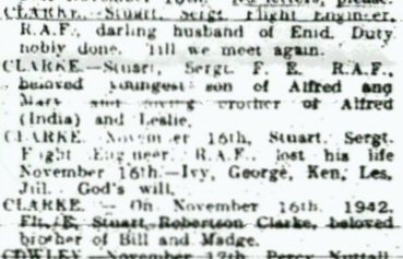 CLARKE. On November 16th 1942. Flt./E. Stuart Robertson Clarke, beloved brother of Bill and Madge. |
