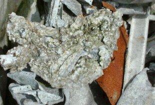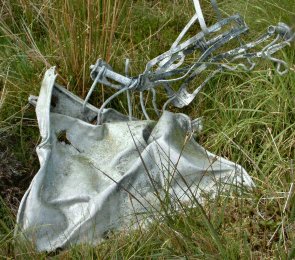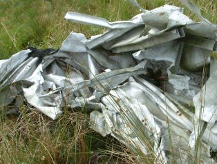 2003 Twisted fuselage panels lay all around the area and the scar to the landscape is easily made out from a distance. Not the usual elongated marks of a crash landing but a circular crater. The plane dived straight into the ground, with no rear control surfaces it would have been an almost vertical descent. The ground is full of small fragments, battery casing, perspex from cockpit instruments and even a small torn piece of parachute silk. |